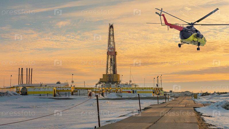 Коллаж. Желтый вертолет на переднем плане. Инфраструктура буровой установки на арктическом нефтегазовом месторождении на заднем плане