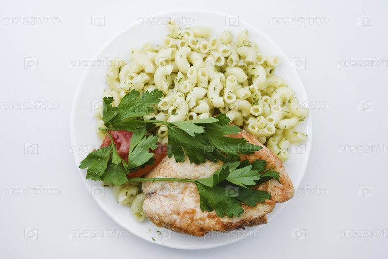 Жареное куриное мясо с гарниром из макарон