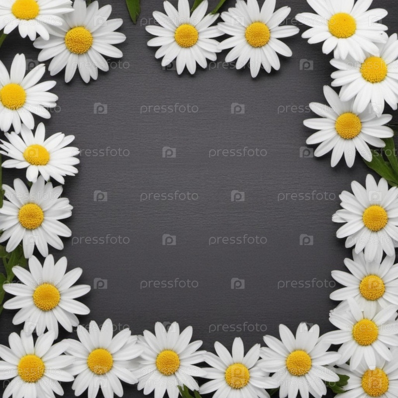 Белые цветы ромашки с желтыми центрами расположены по кайме на черном фоне. Ромашки свежие и яркие. Края рамки. Изображение обеспечивает простой и естественный фон для текста или элементов дизайна