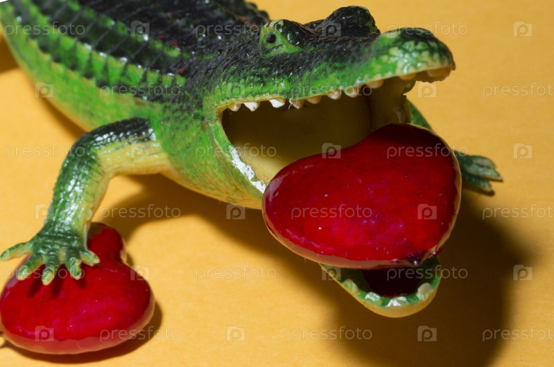 Игрушка крокодил на желтом фоне с сердцем в пасти