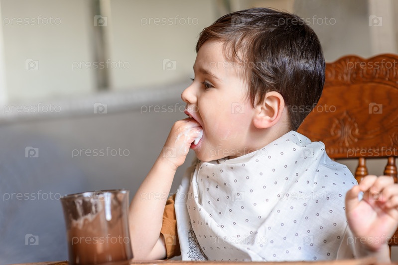 Маленький мальчик ест руками и весь в еде