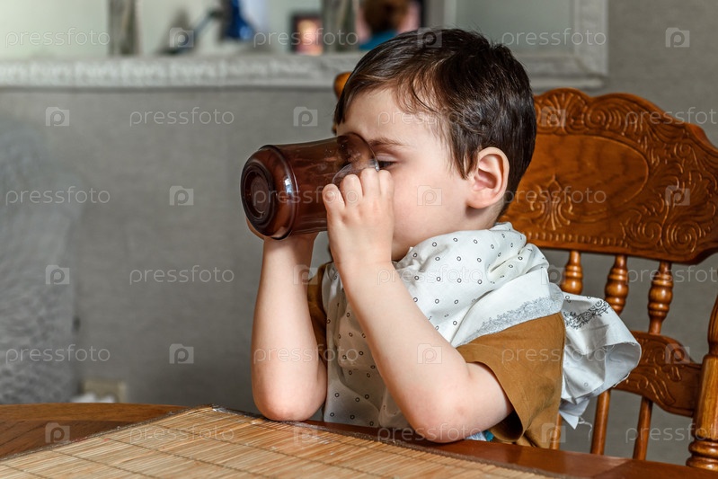 Маленький мальчик пьет из кружки сам