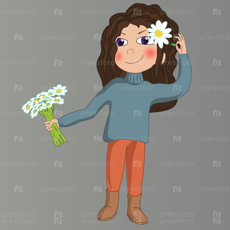 Милая маленькая школьница с цветами в руке и цветком в волосах