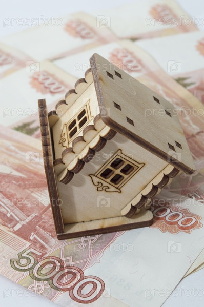 Деревянный дом стоит на крыше с большим количеством купюр номиналом пяты тысяч. Покупка или продажа недвижимости. Оформление ипотеки. Неудачная сделка, обман, мошенничество