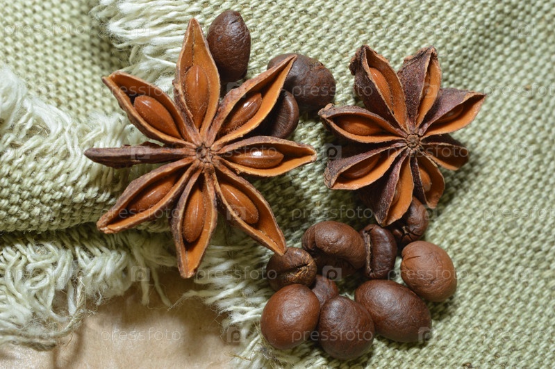Плоды бадьяна. Звездочки с семенами. Зерна кофе