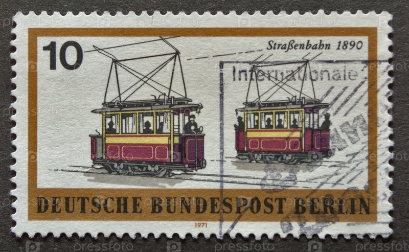 Почтовая марка с гашением Запад-ный Берлин 1971 год. Транспорт в Берлине: железнодорожный подвиж-ной состав. Трамвай (1890)