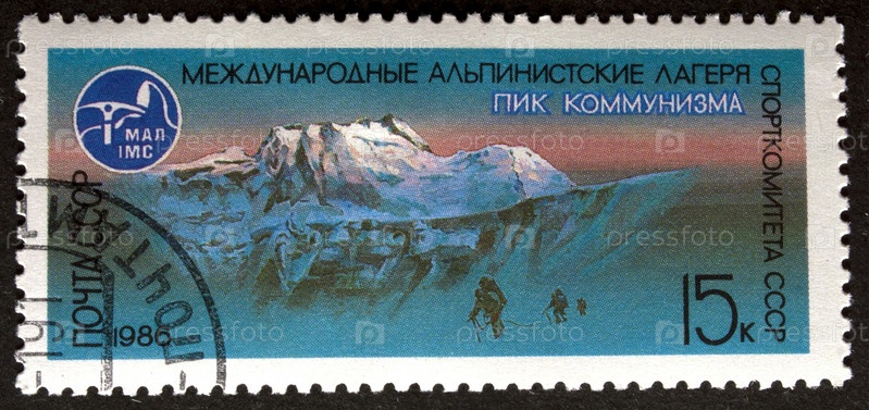 Почтовая марка с гашением СССР 1986 год. Международные альпинистские лагеря СССР. Пик Коммунизма (7495 м.), горы Памир, Таджикистан