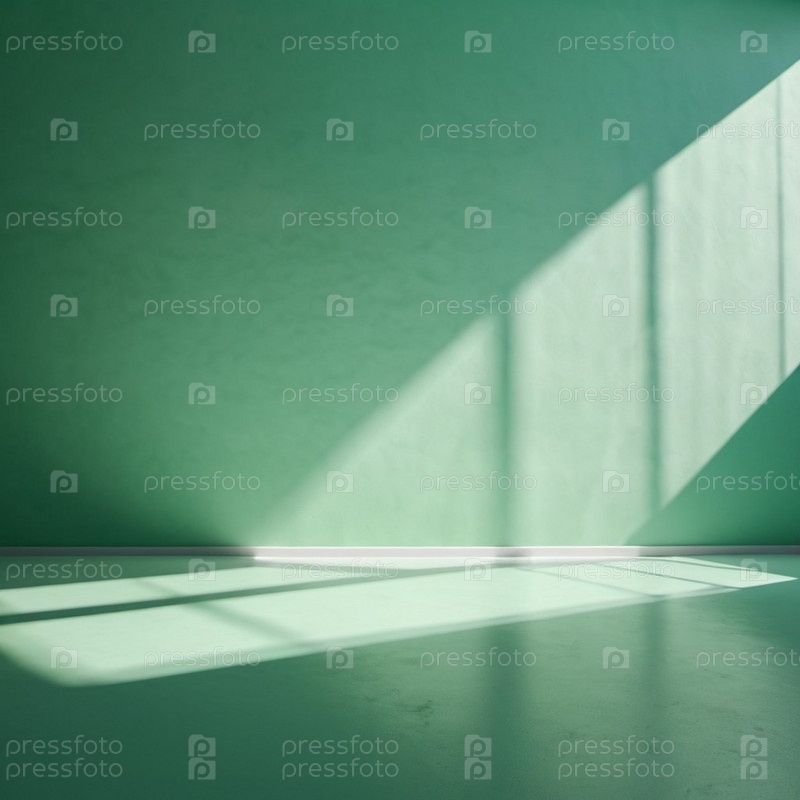 Зеленая стена и большое окно. Солнечный свет струится через окно, отбрасывая длинные тени на стену. Комната светлая и просторная, чистая, в стиле минимализма. Фон для интерьера или демонстрации продукта