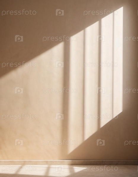 Бежевая стена и большое окно. Солнечный свет струится через окно, отбрасывая длинные тени на стену. Комната светлая и просторная, чистая, в стиле минимализма. Фон для интерьера или демонстрации продукта