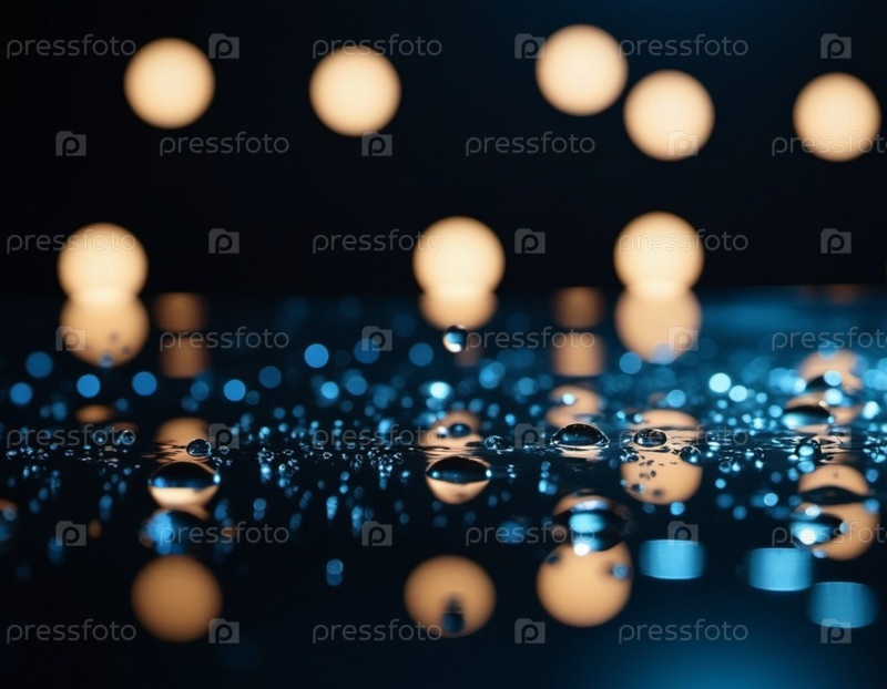 Капли воды на поверхности отражают расфокусированный свет, создавая эффект боке. Капли кажутся прозрачными и круглыми, отражая теплый желтый свет размытых огней на заднем плане
