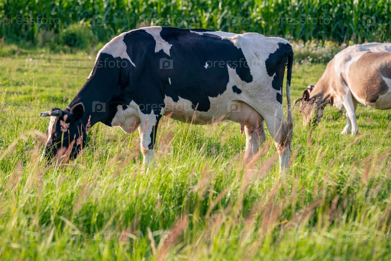 Коровы пасутся на сочном лугу в летний день