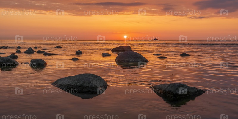 Спокойный оранжевый закат на вечернем морском рыболовном корабле на горизонте