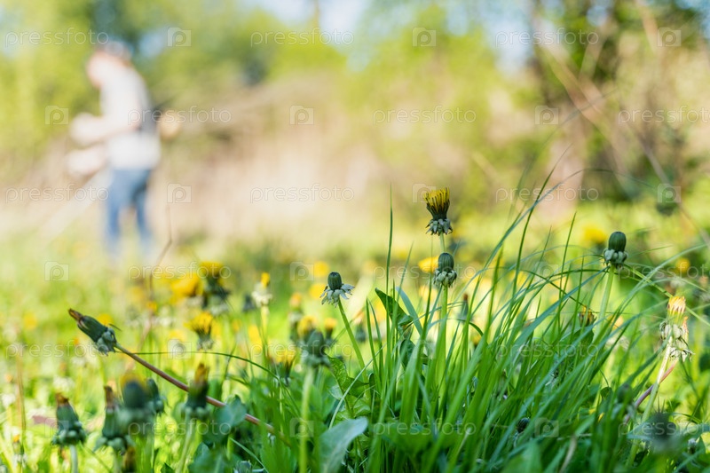 Мужчина косит траву триммером, фокусируется на размытом фоне переднего плана