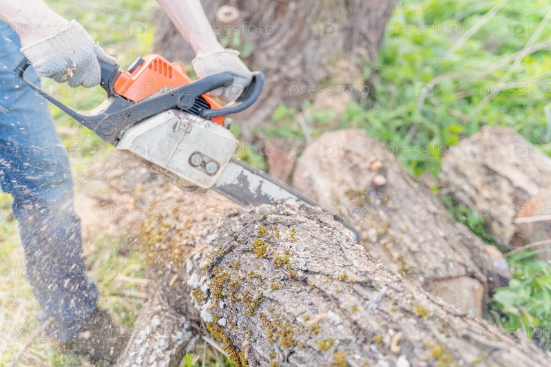 Фермер распиливает дерево бензопилой, избирательный фокус, фокус на переднем плане, размытый фон