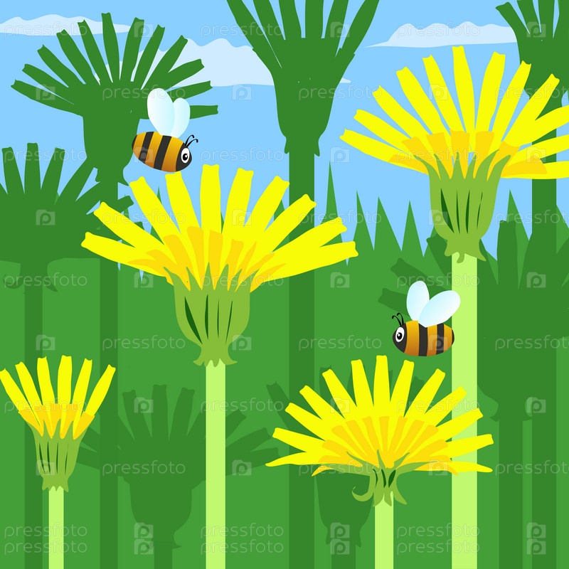 Красивый фон цветущих одуванчиков и летающих рядом пчел
