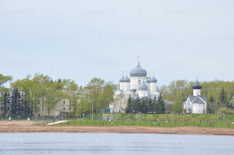 Вид на Зверино-Покровский монастырь в Великом Новгороде со стороны реки Волхов: Покровский собор (середина XIX - XX века) и Симеоновская церковь (церковь Симеона Богопринимателя XV век)