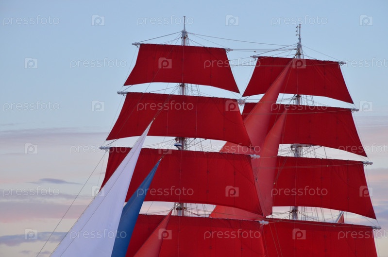 Бриг Россия с развернутыми парусами алого цвета на репетиции праздника для выпускников Алые паруса в Санкт-Петербурге в июне 2024