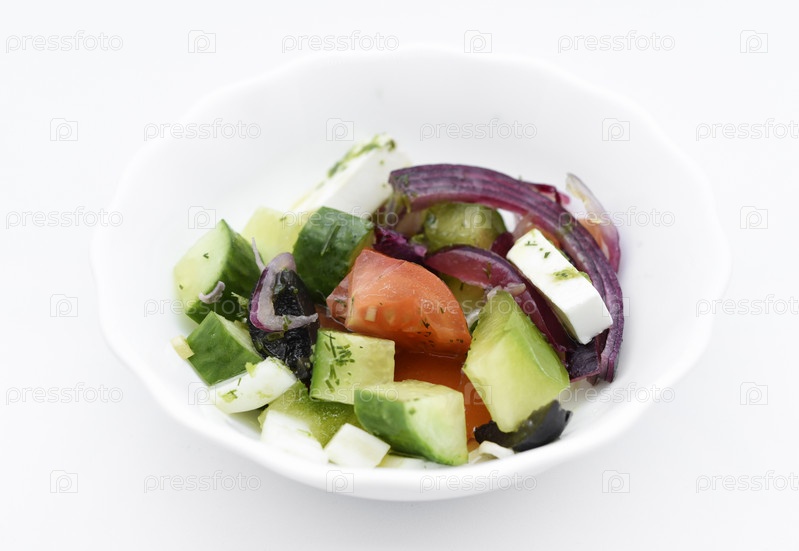 Сочный свежий салат в миске. Огурцы, помидоры и оливки