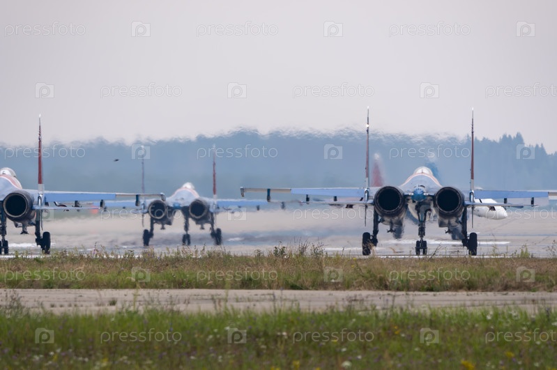 Москва Россия Аэродром Жуковский 25 июля 2021 года: Пилотажные группы "Русские витязи" на самолетах Су-35 международного аэрокосмического салона МАКС-2021