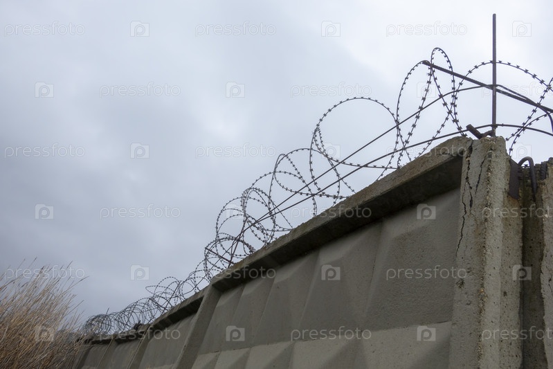 Колючая проволока над бетонной стеной на фоне облачного неба