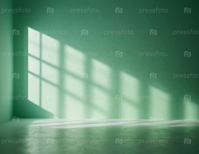 Зеленая стена и большое окно. Солнечный свет струится через окно, отбрасывая длинные тени на стену. Комната светлая и просторная, чистая, в стиле минимализма. Фон для интерьера или демонстрации продукта