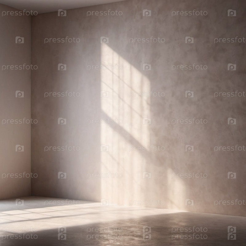 Коричневая бежевая стена и большое окно. Солнечный свет струится через окно, отбрасывая длинные тени на стену. Комната светлая и просторная, чистая, в стиле минимализма. Фон для интерьера или демонстрации продукта