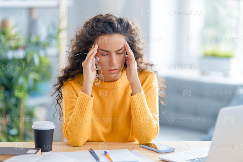 Молодая женщина учится и у нее болит голова