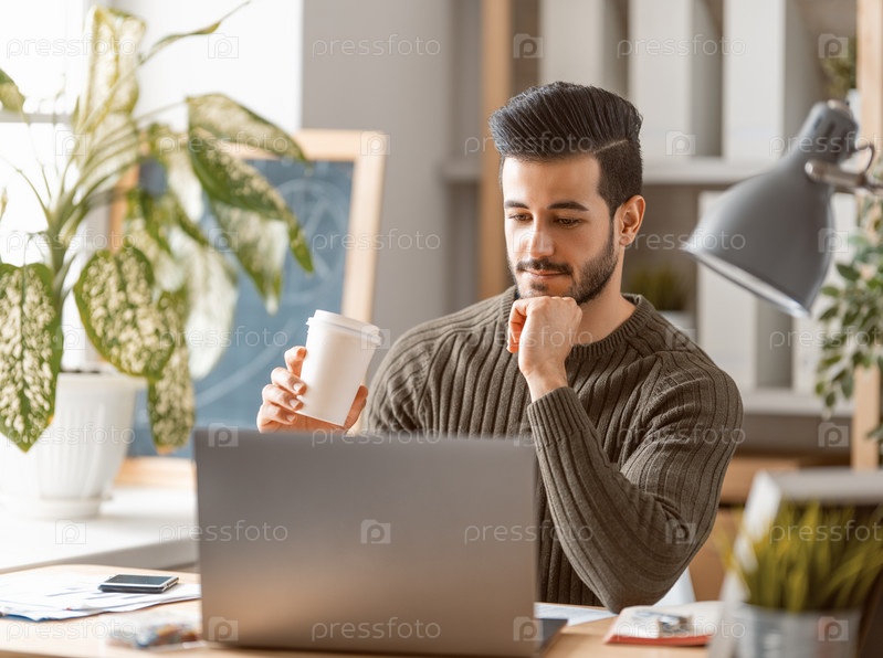 Мужчина работает на ноутбуке дома
