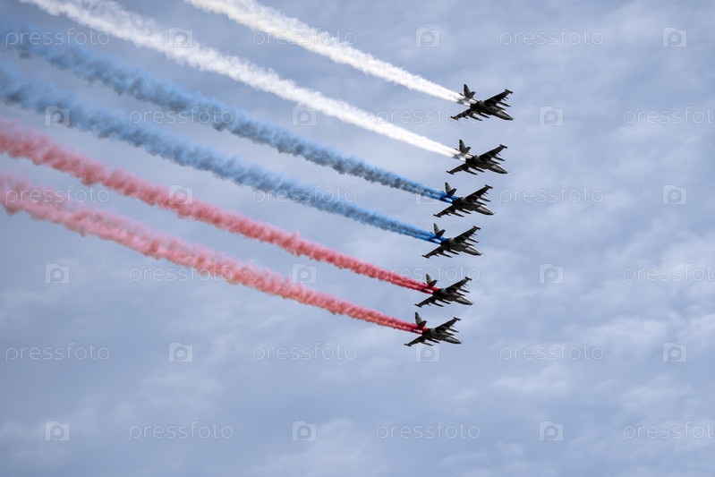 МОСКВА, РОССИЯ - 7 мая 2021 года: Авиапарад в Москве. Группа российских истребителей Су-25 с нарисованным российским флагом в небе на параде Победы во Второй мировой войне в Москве, Россия