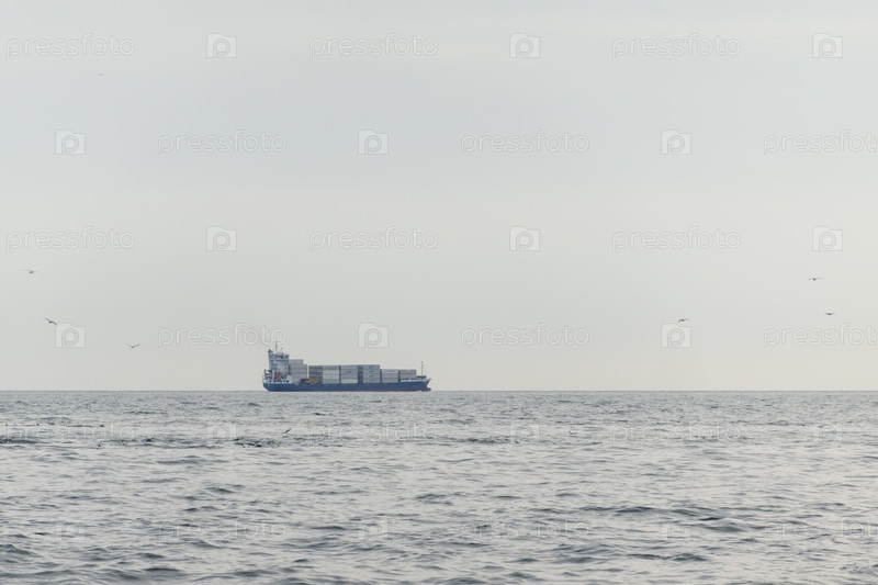 Морское грузовое судно плывет посреди океана с большими волнами