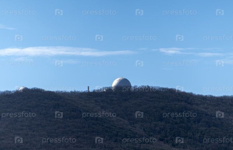 Белый купол обсерватории на горе в лесу на фоне неба
