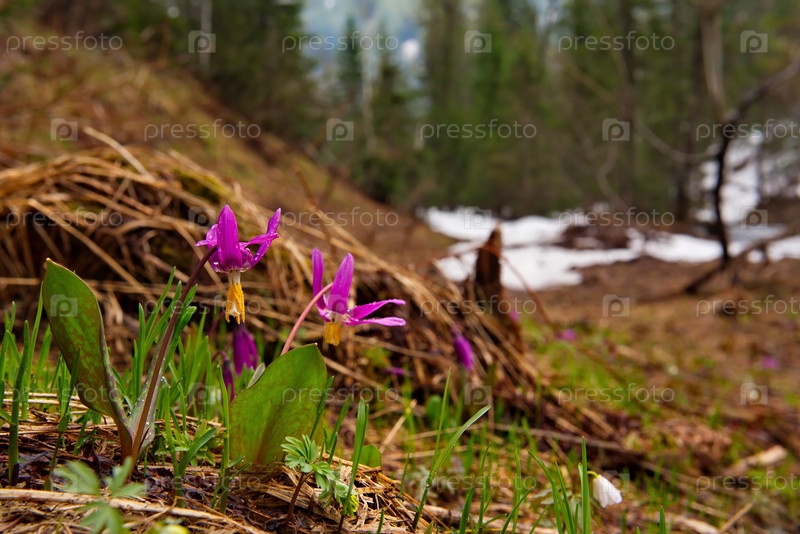 Россия. Юг Западной Сибири, Кузнецкий Алатау. Сибирские весенние цветы (кандык) на южных склонах гор вдоль реки Томь
