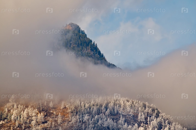 Россия. Горный Алтай. Кусты, покрытые инеем ранним весенним утром на перевале Кату-Ярык с видом на долину реки Чулышман