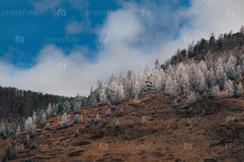 Россия. Горный Алтай. Кусты, покрытые инеем ранним весенним утром на перевале Кату-Ярык с видом на долину реки Чулышман