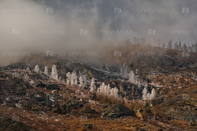 Россия. Горный Алтай. Кусты, покрытые инеем ранним весенним утром на перевале Кату-Ярык с видом на долину реки Чулышман