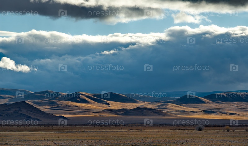 Россия. Юг Западной Сибири, горный Алтай. Необычные контрасты частично освещенного заходящим солнцем горного рельефа вдоль долины реки Чуя близ села Кош-Агач
