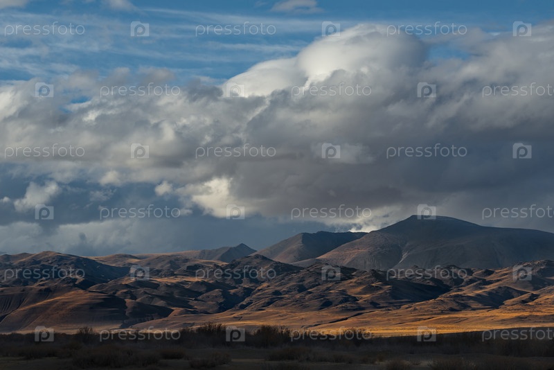 Россия. Юг Западной Сибири, горный Алтай. Необычные контрасты частично освещенного заходящим солнцем горного рельефа вдоль долины реки Чуя близ села Кош-Агач