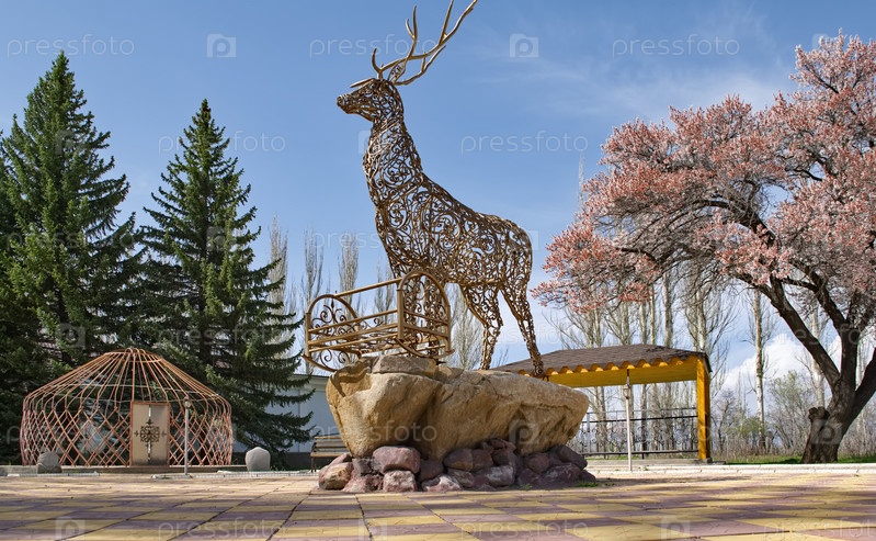 Каракол, Кыргызстан. 24 апреля 2024 года. Металлическая скульптура рогатого оленя в парке музея великого путешественника Пржевальского Николая Михайловича
