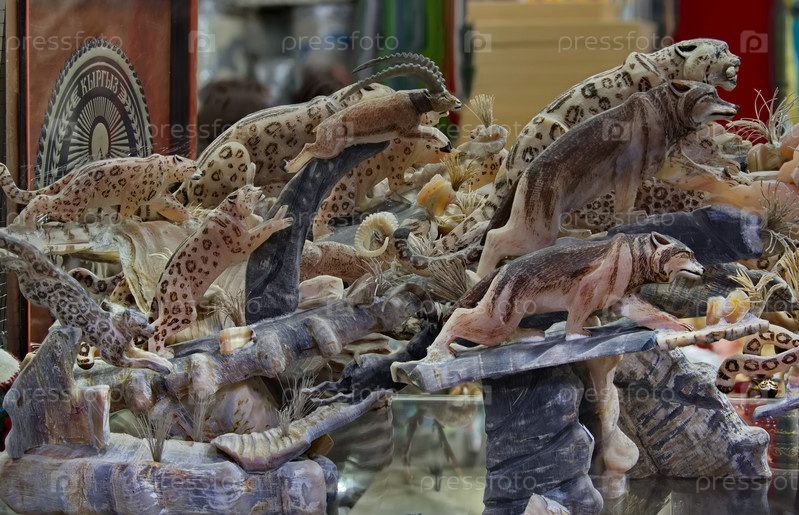 Бишкек, Кыргызстан. 28 апреля 2024 года. Прилавок сувенирного магазина с фигурками диких зверей, изготовленные из поделочных камней