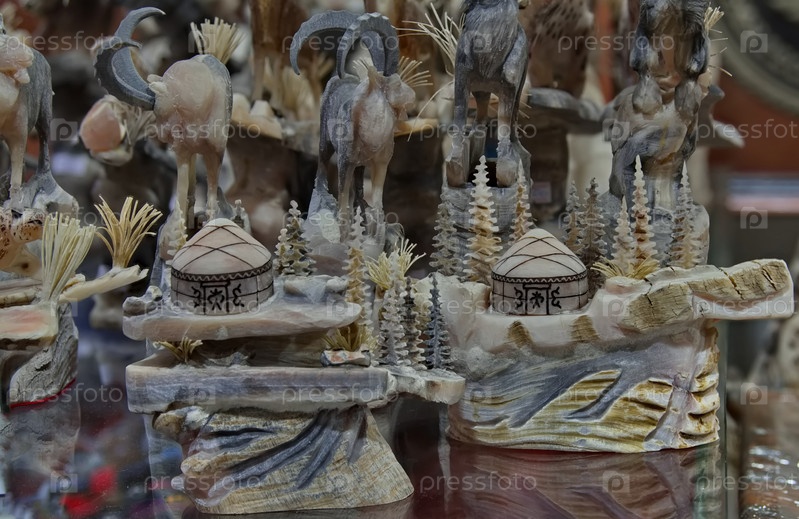 Бишкек, Кыргызстан. 28 апреля 2024 года. Прилавок сувенирного магазина с фигурками диких зверей, изготовленные из поделочных камней