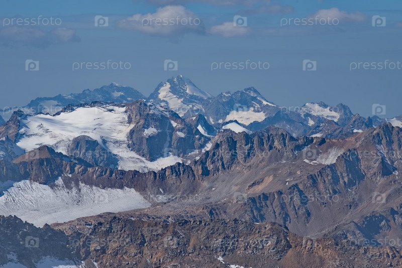 Россия. Северный Кавказ. Потрясающий по красоте вид на пики Кавказского хребта с заснеженного склона высочайшей горы Европы Эльбрус
