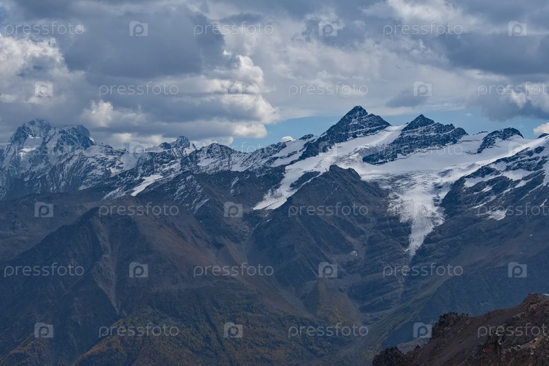 Россия. Северный Кавказ. Потрясающий по красоте вид на пики Кавказского хребта с заснеженного склона высочайшей горы Европы Эльбрус