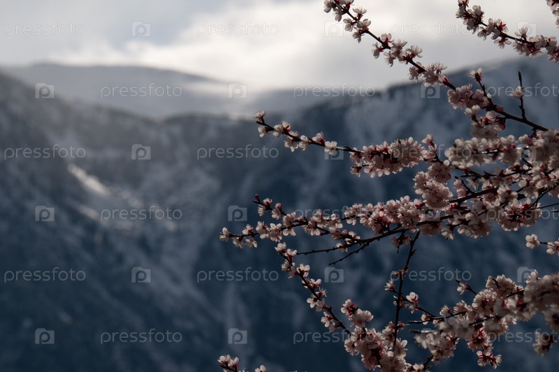 Россия. Горный Алтай. Ветка цветущего абрикосового дерева на берегу Телецкого озера
