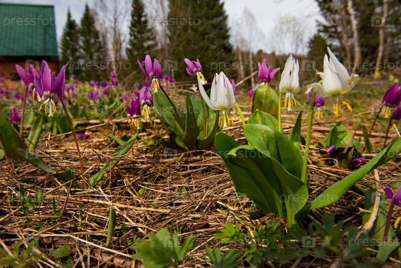 Россия. Юг Западной Сибири, Кузнецкий Алатау. Сибирские весенние цветы (кандык) на южных склонах гор вдоль реки Томь