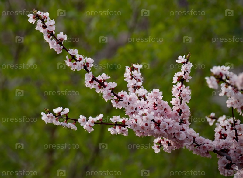 Россия. Горный Алтай. Ветка цветущего абрикосового дерева на берегу Телецкого озера