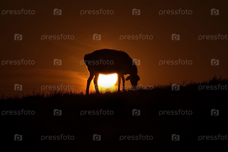 Казахстан. Пасущаяся овца на фоне заходящего солнца в степях природного горного парка Баянаул