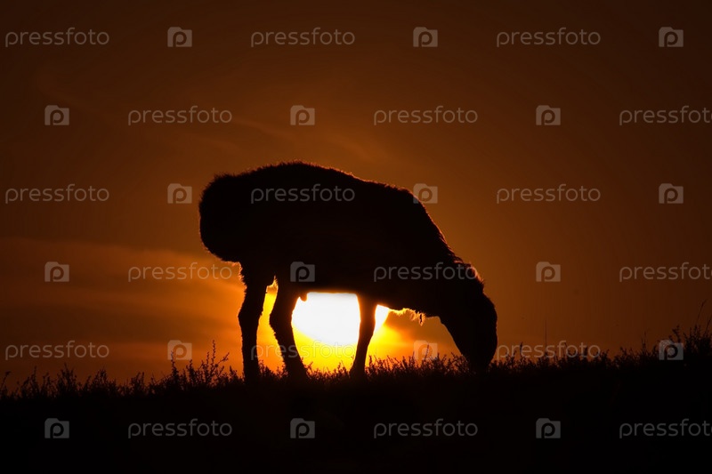 Казахстан. Пасущаяся овца на фоне заходящего солнца в степях природного горного парка Баянаул