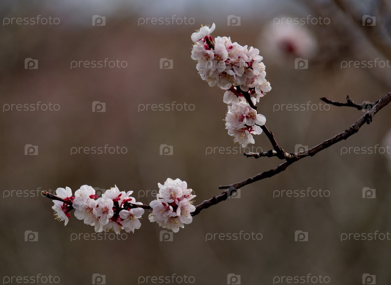 Россия. Горный Алтай. Ветка цветущего абрикосового дерева на берегу Телецкого озера