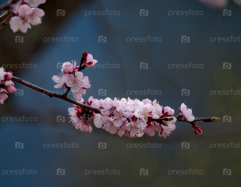 Россия. Горный Алтай. Ветка цветущего абрикосового дерева на берегу Телецкого озера