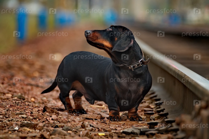 Россия. Кузнецкий Алатау. Пожилая такса гуляет по железнодорожному полотну